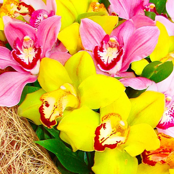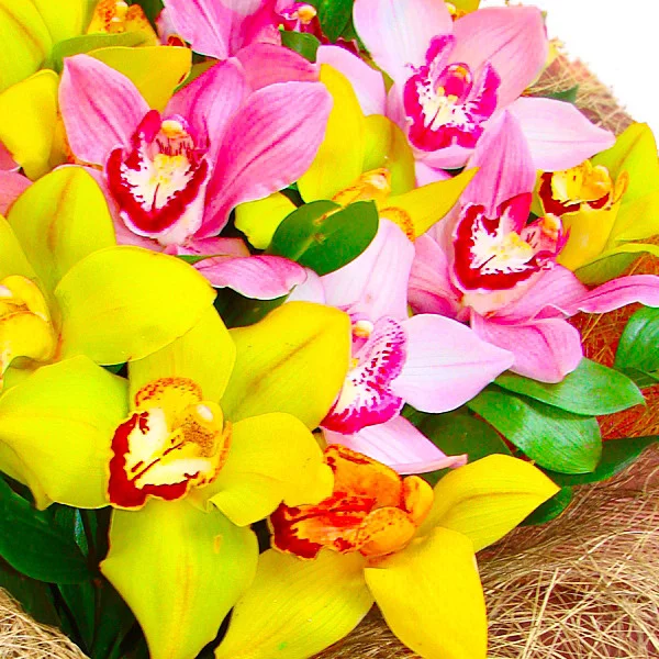 Ах, сколько романтизма и невинности в этой композиции из желто- розовых орхидей. Волнующий аромат, изысканная форма, роскошное сочетание – идеальны для подарка сильной, но в тоже время тонко чувствующей личности.